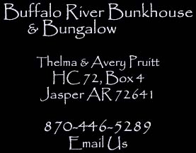 Looking for a place to stay in Jasper, Arkansas while you float the Buffalo National River or hike the Ozark Mountains? Well, we have just the place for you! The Buffalo River Bunkhouse & Bungalow is a vacation rental that offers comfort and convenience at affordable prices. Come float the Buffalo, take a hiking trip in the Ozarks, go caving or just enjoy the Elk Capital of Arkansas. Why stay in expensive crowded cabins or motels when you can stay in your own private bunkhouse or bungalow? Accomodations available for singles, couples or groups! "Every morning when I awake," says cabin owner Thelma Pruitt, "I'm reminded that I live in paradise." She's speaking of the pastoral scenery of the Little Buffalo River valley just one mile east of Jasper on Highway 74. The Pruitt ancestors, John D. and Vernetta Jane Pruitt, settled here in the 1800s and made their home along the banks of the Little Buffalo River. A dirt lane on the property near a large meadow leads right down to the river. The Pruitt family cemetery is located a mile down the road. Buffalo River Bunkhouse & Bungalow are 2 rental units on part of the original Pruitt homestead where 5 generations of Pruitts farmed and ranched. The property has evolved to fit modern times as the 2 vacations rentals were renovated from existing buildings and are rented out to guests who come to float the Buffalo, hunt, hike or simply visit family in the area. Due to the winding roads and scenic beauty, this region is becoming increasingly popular to motorcycle enthusiasts. We welcome bikers at Buffalo River Bunkhouse & Bungalow. In addition to the convenient location so near Scenic Hwy 7, cyclists really appreciate the paved driveway and the covered parking for their bikes. | ||||||||||||