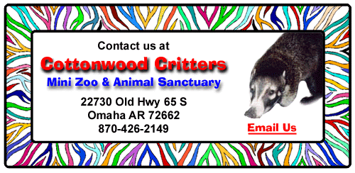Cottonwood Critters is a USDA licensed facility. We have wildlife and Branson city permits. We greatly appreciate ANY and ALL donations. If you know of an animal* that has been abused, abandoned or that just needs a good home, feel free to call or email us at any time and we will try to help. | |||||||||||||||||||||||||||||||||||||||